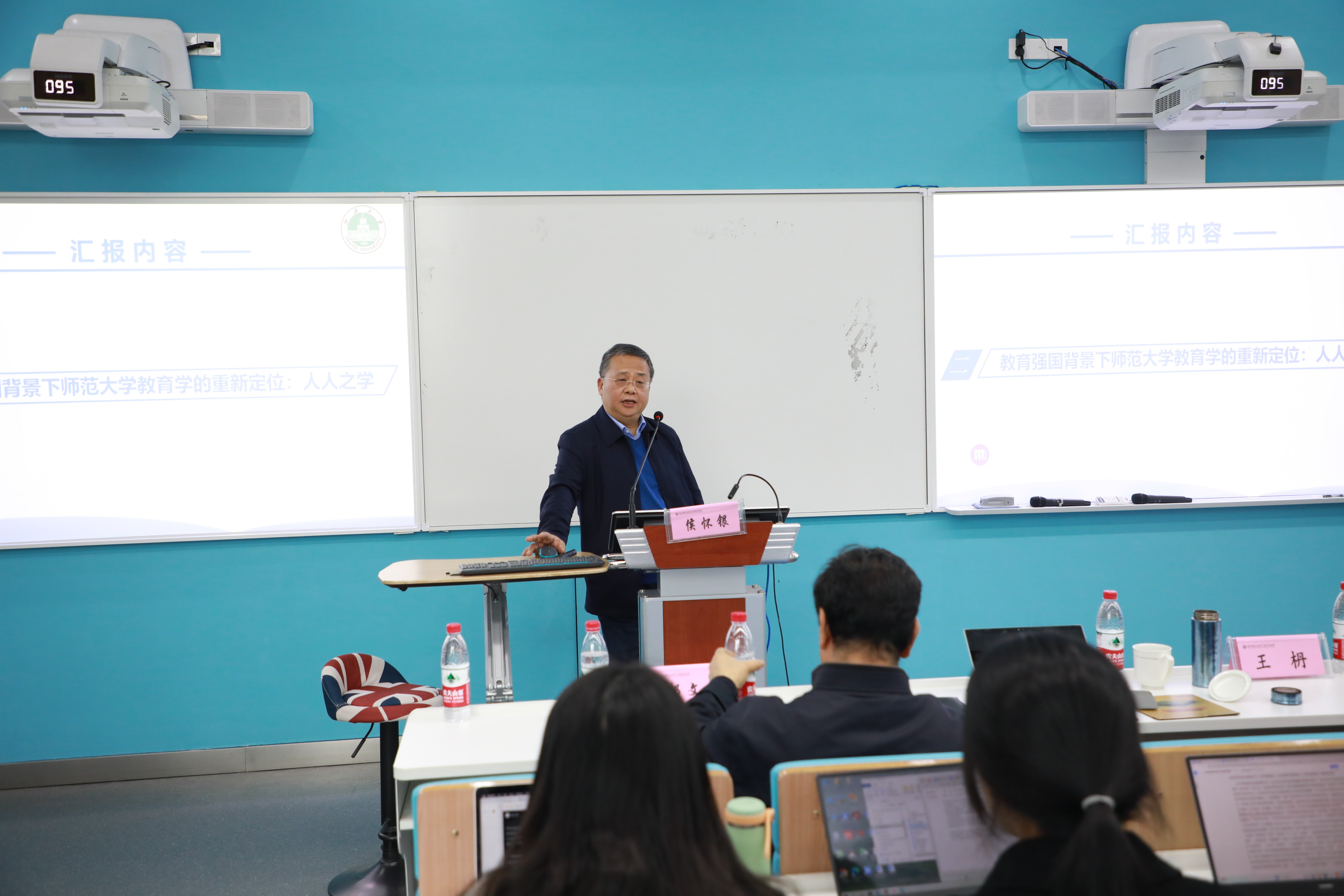 来自山西大学侯怀银教授则是以“重新认识教育强国背景下教育学在师范大学的地位”展开论述。侯教授指出,师范大学教育学的传统地位是未来教师之学。而在教育强国背景下师范大学教育学有了重新定位,便是人人之学。随着时代变迁,以及师范大学和教育学的发展,教育学仅仅作为教师之学已经无法满足自身发展需求,也无法推动师范大学办学质量的进一步提升。接着侯教授进一步指出,教育强国背景下我们要推动师范大学教育学成为人人之学。另外,侯教授还从确立学科兴趣、定位学科责任、强化学科认同等六个方面为研究生讲解如何做教育学研究,鼓励同学们充分认识自我,做好自我规划。