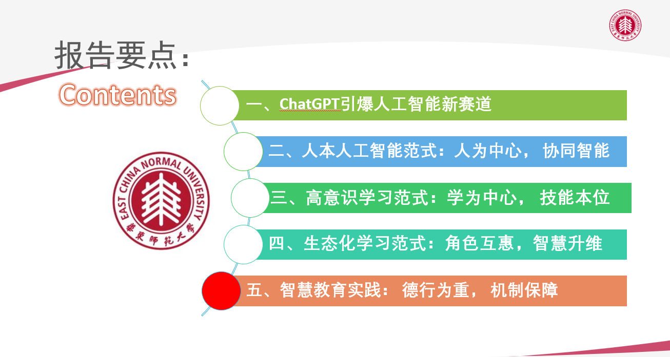祝智庭教授的报告围绕“ChatGPT引爆人工智能新赛道”,“人本人工智能范式:人本中心、协同智能”,“高意识学习范式:学为中心 技能本位”,“生态化学习范式:角色互惠、智慧升维”和“智慧教育实践:德行为重、机制保障”五大要点展开。