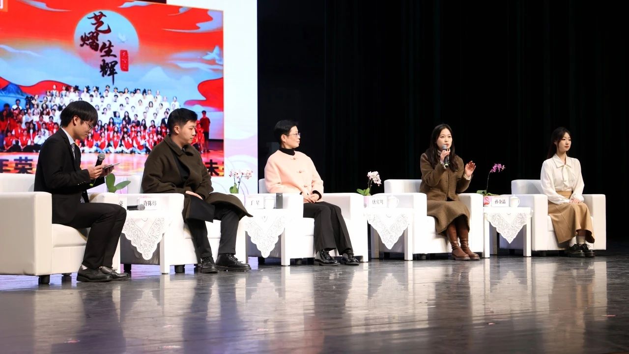 随后,艺术教育系主任丁星老师、校团委唐宾篲老师、22届校友许陈炜、在校生代表学前223班孙金晶同学四位“六艺节”深度参与者,受邀上台作为对话嘉宾。丁星主任介绍了学院创办“六艺节”的初心,“六艺节”的创办承载着学院百十五年来的艺术教育传统,是新时代“以艺育德·以美润教”的师范教育传承和创新。唐宾篲老师曾任学院“六艺节”的组织者,分享了她在指导学生团队开展“六艺节”过程中有关“自豪”的两个小故事,她提到“六艺节”让同学们得到了充分的历练,收获了成长,为毕业后踏上工作岗位积累了克服困难的勇气和智慧。面对“六艺节”的挑战,已亲历过一届“六艺节”的大二学前教育专业同学孙金晶,分享了她在准备“六艺节”集体和个人的项目中遇到了时间安排和团队排练等困难。但依靠集体的团结,她和班级同学超越了自我,取得了优异的成绩。“六艺节”不只是个展现自我的舞台,更是激励自我的驱动器。“六艺节”让许陈炜校友重拾中国画、重燃梦想,在中国画的领域展现自我,成功考入浙江大学,成为中国画专业硕士研究生,许学长还分享了在“六艺节”中合理安排时间的好方法。四位嘉宾围绕“自豪时刻”“多重视角”“共同期盼”这三个话题,作为组织者、亲历者和参与者,分享了关于“六艺节”感人故事,对历经二十载推陈出新并开启新征程的“六艺节”表达了美好祝愿。