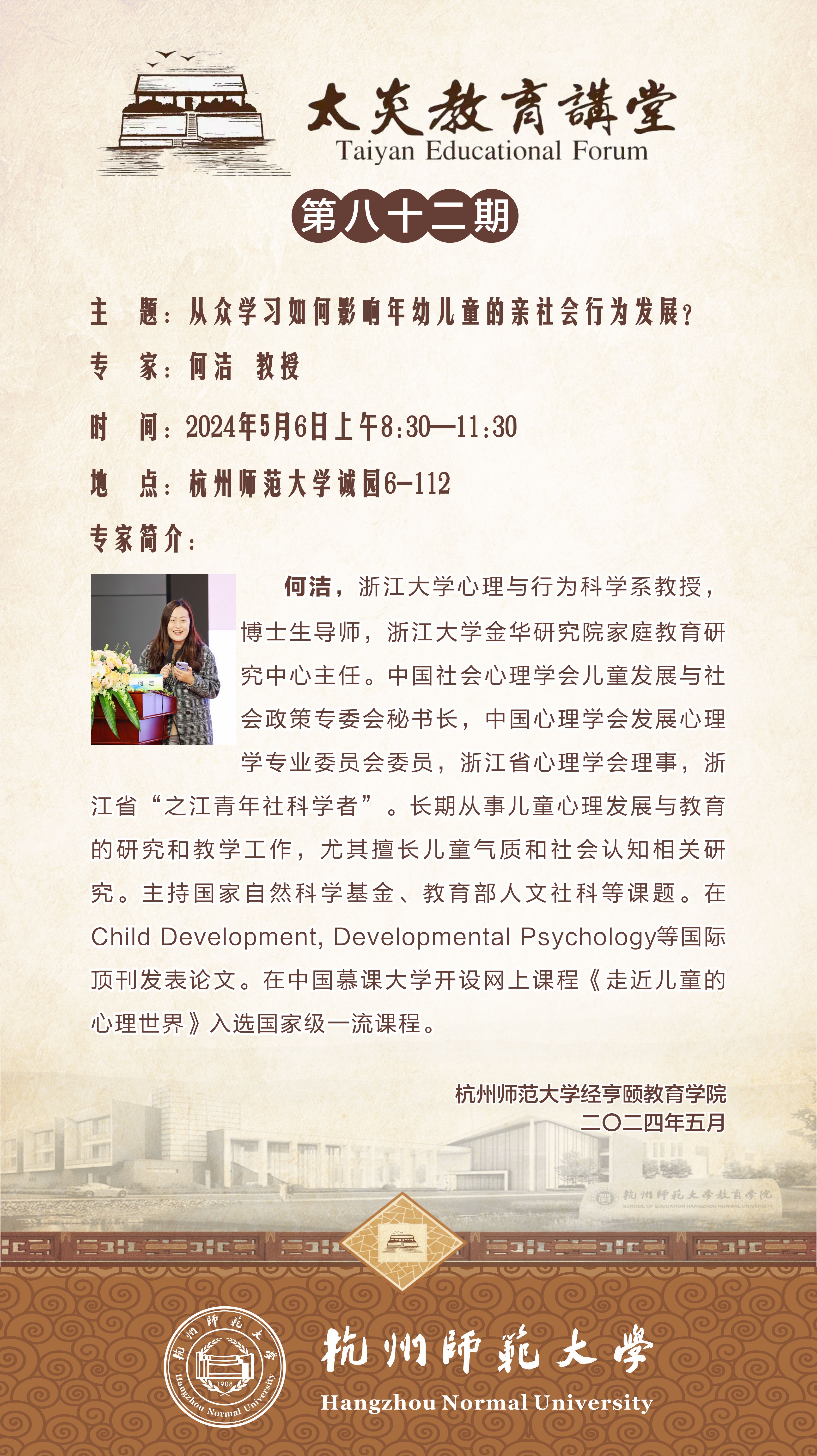 何洁,浙江大学心理与行为科学系教授,博士生导师,浙江大学金华研究院家庭教育研究中心主任。中国社会心理学会儿童发展与社会政策专委会秘书长,中国心理学会发展心理学专业委员会委员,浙江省心理学会理事,浙江省“之江青年社科学者”。长期从事儿童心理发展与教育的研究和教学工作,尤其擅长儿童气质和社会认知相关研究。主持国家自然科学基金、教育部人文社科等课题。在Child Development, Developmental Psychology等国际顶刊发表论文。在中国慕课大学开设网上课程《走近儿童的心理世界》入选国家级一流课程。