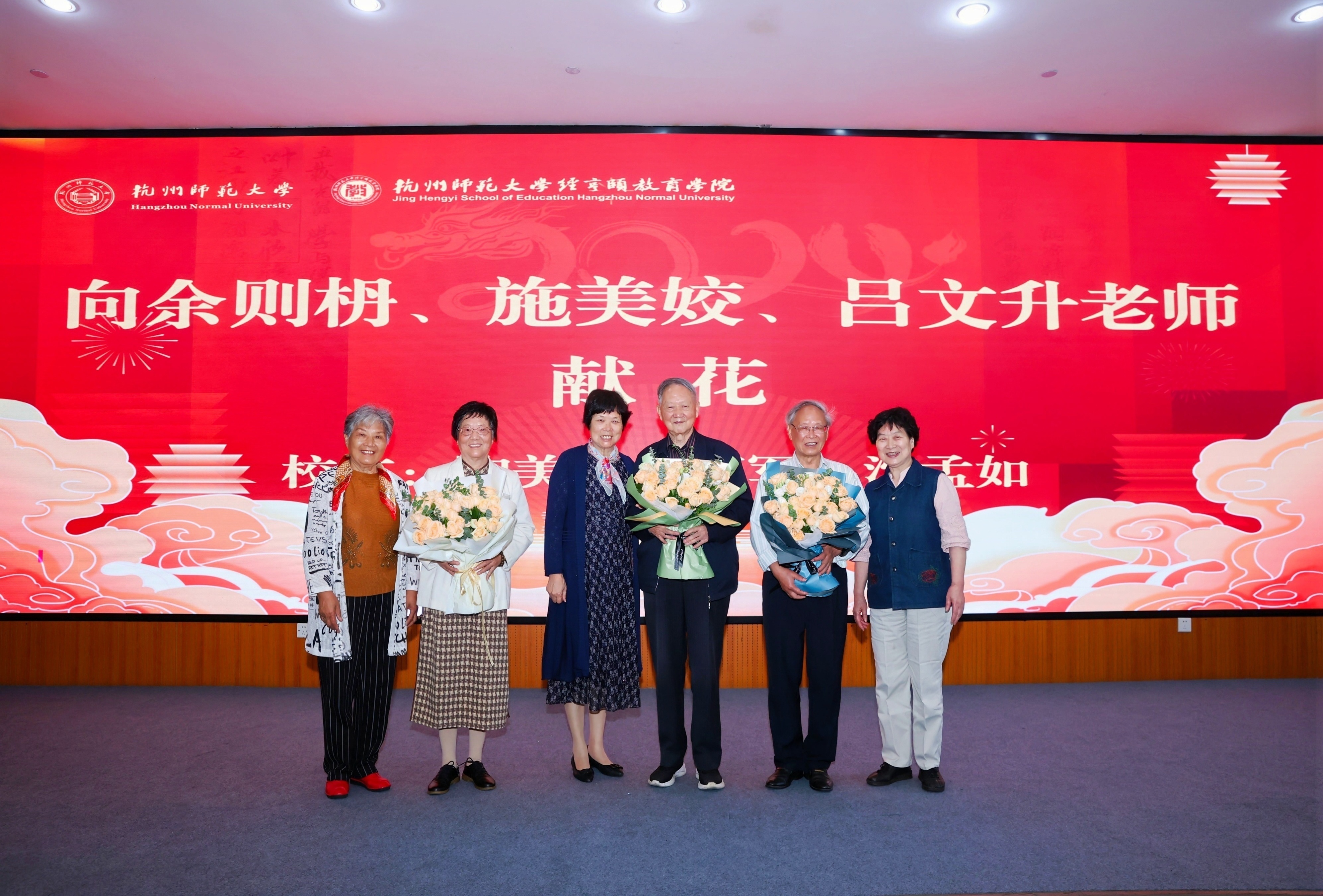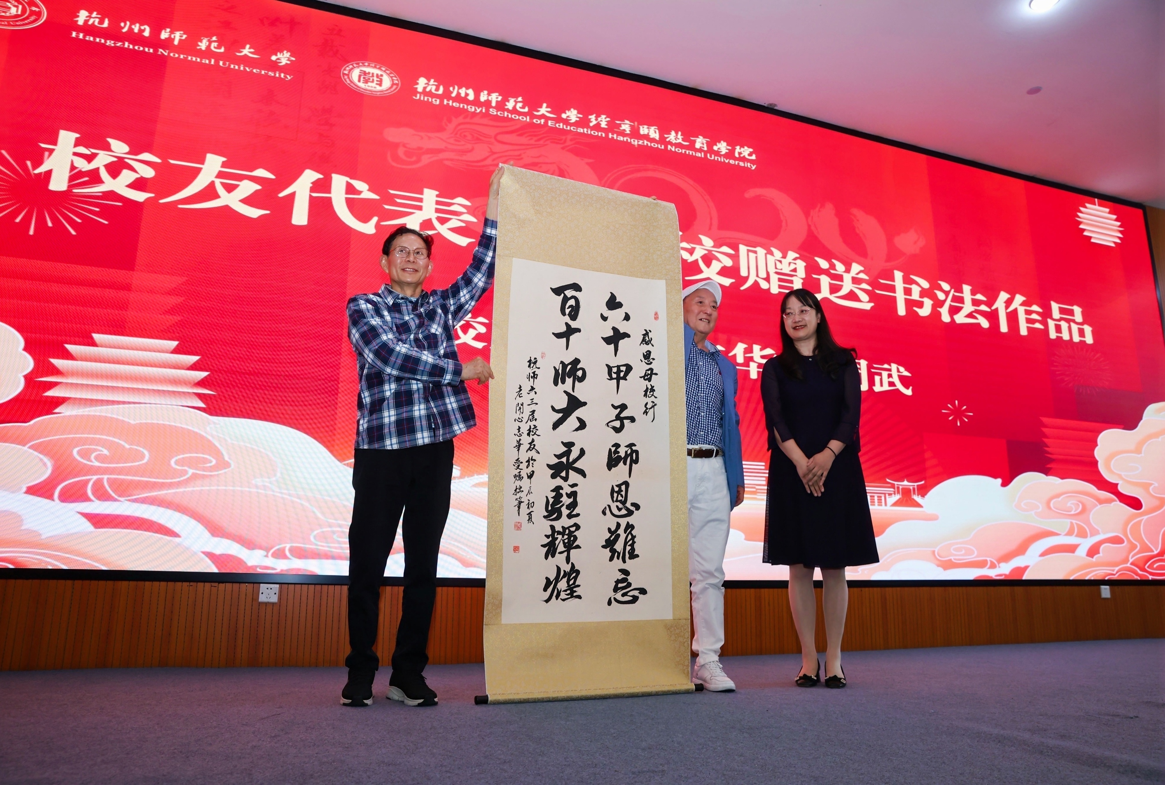 校友们也为返校活动精心准备了礼物,校友代表周志华向学校捐赠了“六十甲子师恩难忘,百十师大永驻辉煌”的书法作品,体现了对母校的感恩之情。感恩教育,铭记师恩,63届校友代表陶美芳、王军和沈梦如向六十年前潜心教导他们成人、成才的余则枬、施美姣、吕文升老师献上了鲜花。他们表示,老师们不仅是知识的传授者,更是他们成长的引路人。