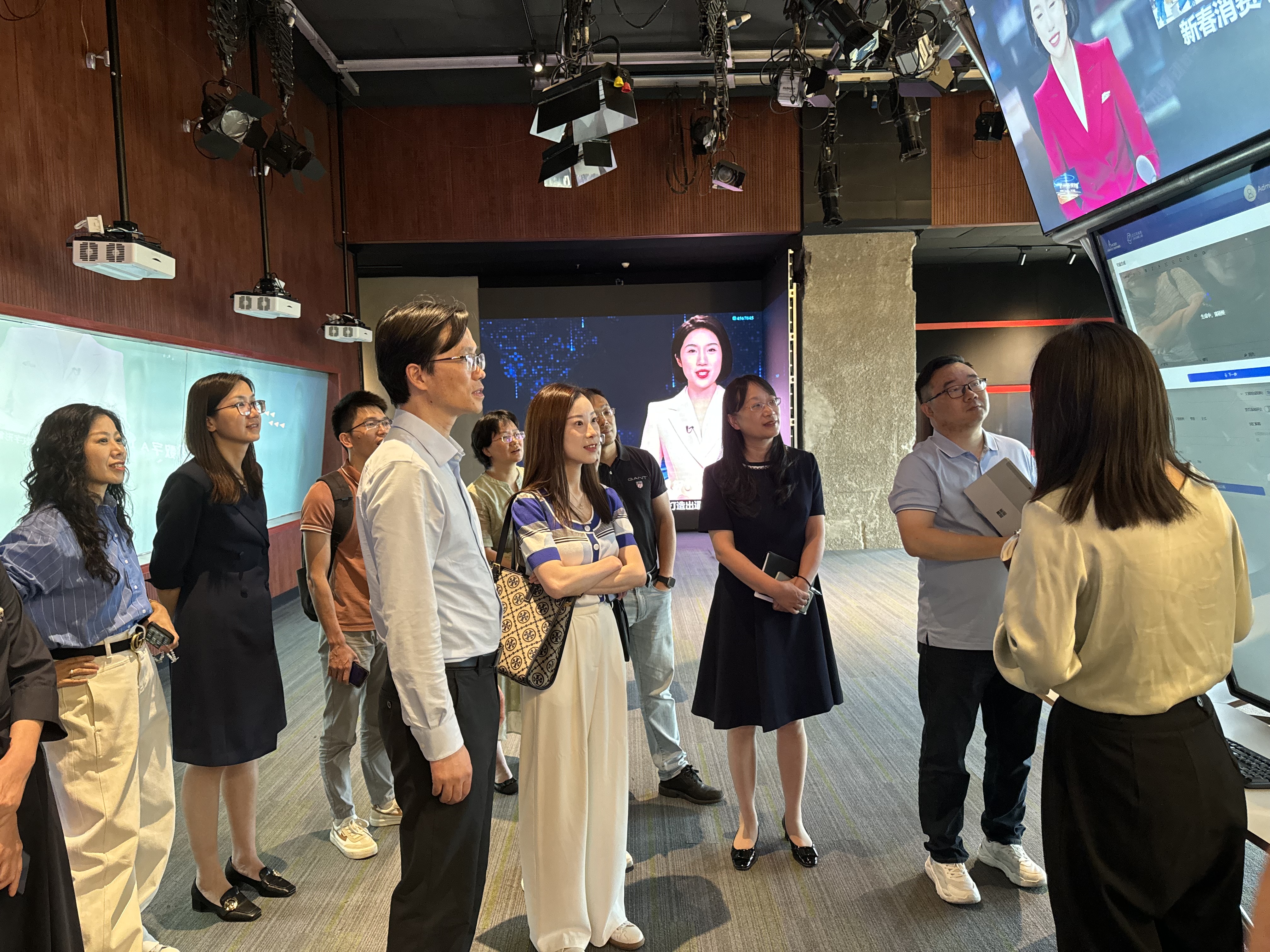 座谈会前,在杭州文广集团融媒体中心主任李岚的陪同下,学院院长严从根、党委书记蒋璐敏、副院长赵立、附属幼儿园园长邵丽美、婴幼儿发展与托育实验室执行主任王道阳、我院各系部主任和各科室负责人等参观了短视频AI生产实验车间,走进车间,数字主播正在播报新闻,“只要输入你想要的内容,就能在短时间内得到一个文案、配音、画面、背景乐齐全的短视频。”听取了负责人关于实验车间空间建设介绍,学院院长严从根、党委书记蒋璐敏一行围绕文本驱动超写真语音生成、超写真数字AI主播生成、智能媒资AI检索、文本驱动视频AI剪辑等创新模块的研发运用现场展开深入交流。