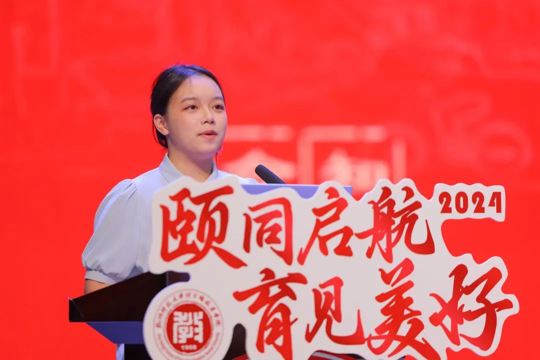 学前教育212班的喻晗代表在校生向新生们分享了自己的经历与感悟。她表示,要在学业和事业上取得成功,需要勤奋学习、深入思考,并且做好未来的规划。遇到机会要敢于抓住,做到知行合一。坚持诚信做人,不忘初心,不断向前。