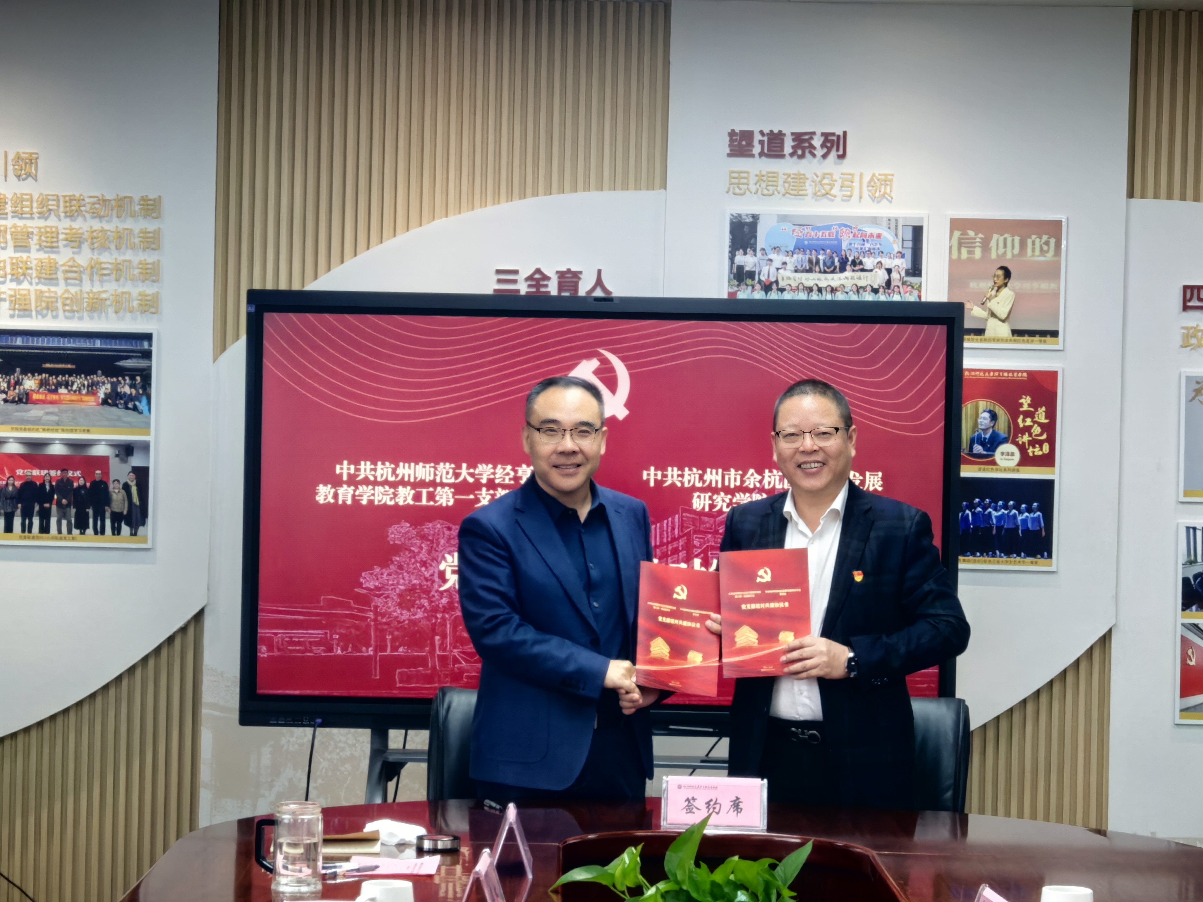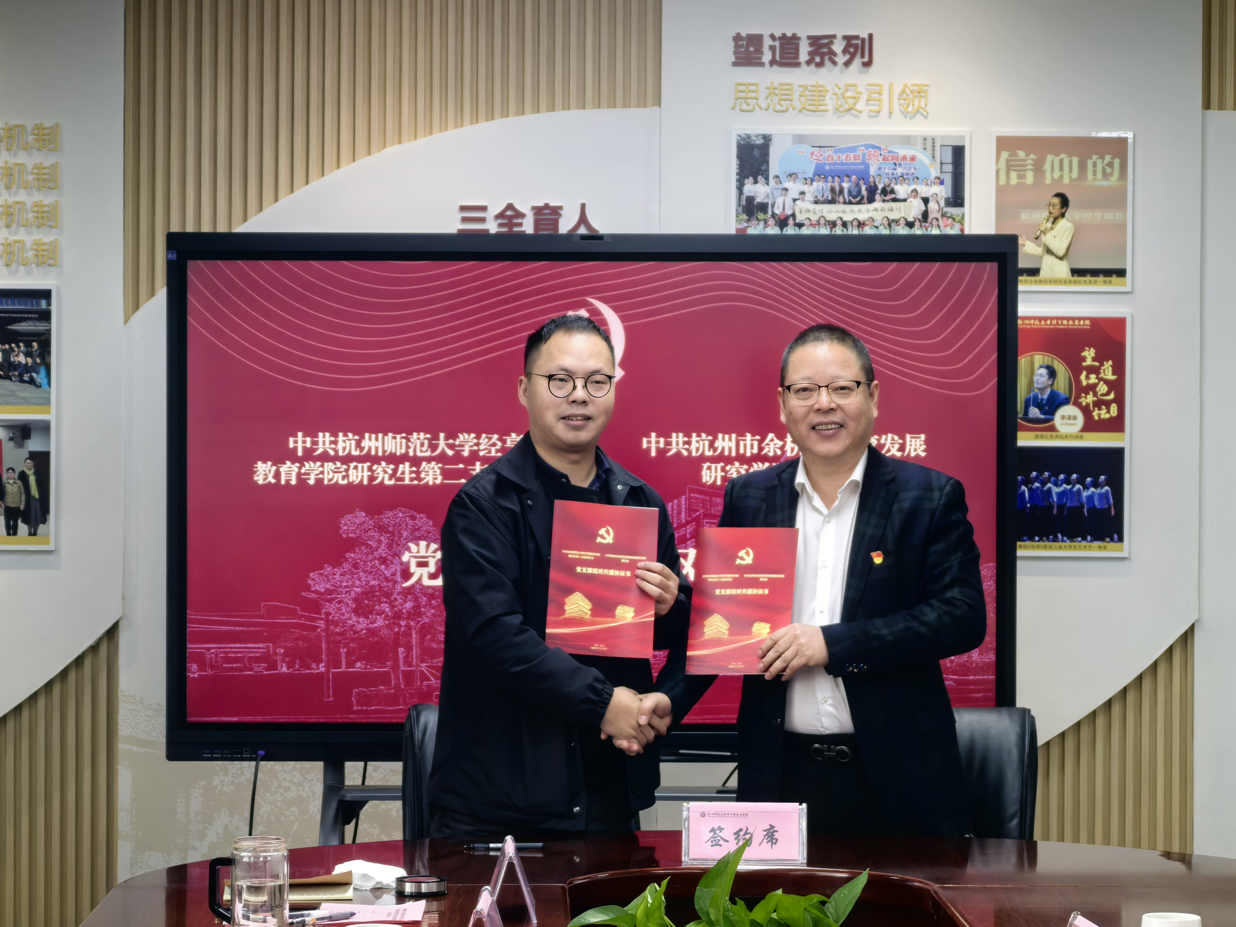 此次交流会上,学院教工第一党支部和研究生第二党支部分别与余杭区教育发展研究学院党委签订党支部结对共建协议书,旨在发挥我院教师教育和余杭区教育发展研究学院的实践优势,共建教师教育研究、实验基地,强化教师教育培训的党建引领,并开展了第一次党建联学,就“教育家精神与全国教育大会精神”为主题展开了学习和讨论。