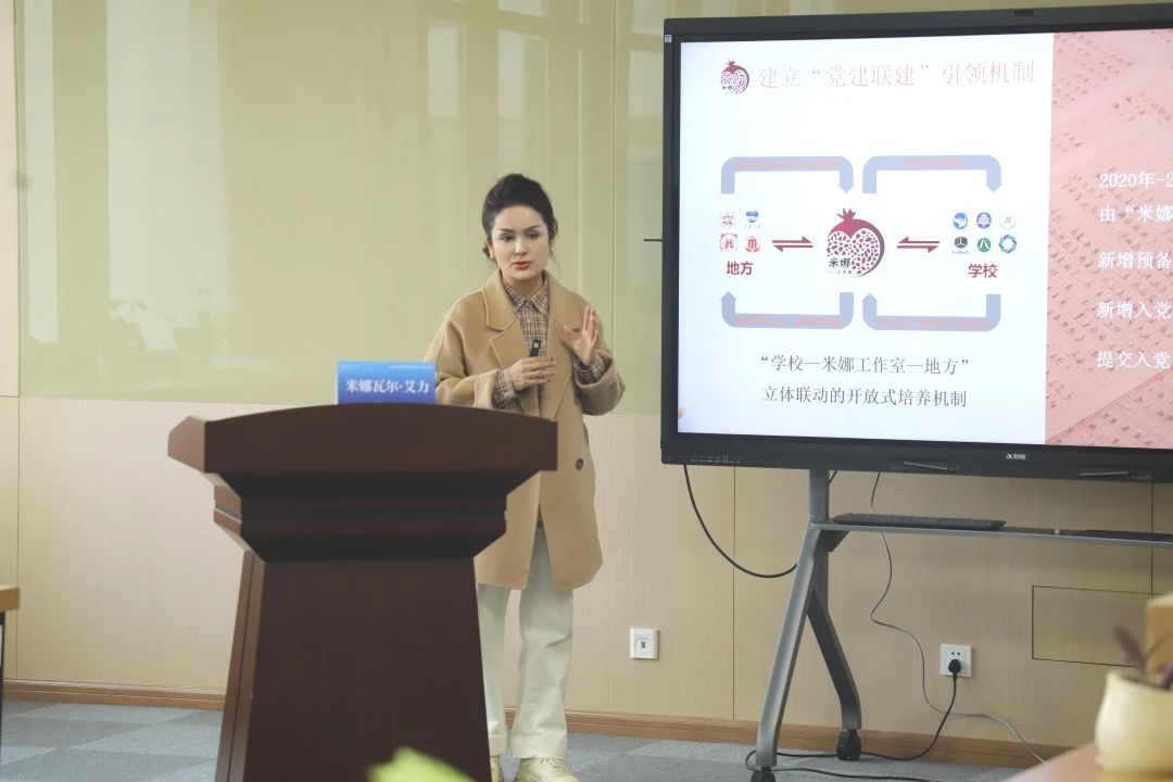 米娜老师围绕辅导员名师工作室,结合自身的建设经验做了毫无保留的分享。“米娜工作室”建立的初心是深化爱国主义,全面推进民族团结进步教育,筑牢中华民族共同体意识。工作室通过持续性、经常性、协同化,开展“铸共”教育,承担学校各民族师生的民族团结进步教育教学工作。同时,工作室以“开放式”培养,构建立体化协同联动机制;以“嵌入式”培育,实施精准化分类服务帮扶;以“体验式”教学,探索社会化实践锤炼路径,进而形成政治引领、高效协同、数字赋能、创新先行的运营模式。