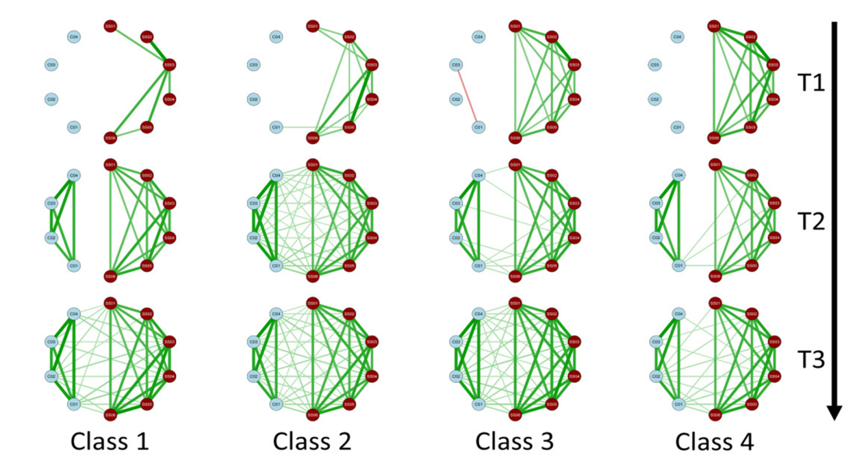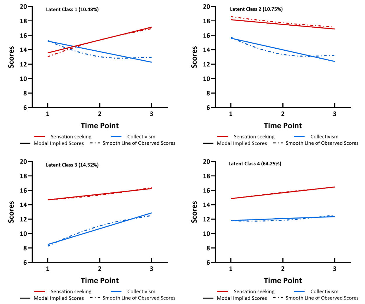 探究社会文化倾向对青少年人格发展的影响是一个重要的理论和实践问题。在中国的集体主义文化背景下,青少年感觉寻求与集体主义观的发展轨迹及其相互作用在很大程度上是未知的。本研究考察了感觉寻求和集体主义观联合发展模式的异质性及其在不同潜在轨迹类别中的相互作用。本研究在中国文化背景下,采用三年纵向追踪设计,使联合增长混合模型(PPGMM)确定集体主义观和感觉寻求的共同发展轨迹;同时采用网络分析模型,对由PPGMM确定的各个类别的三个时间点分别构建网络,揭示集体主义观和感觉寻求之间的相互作用。