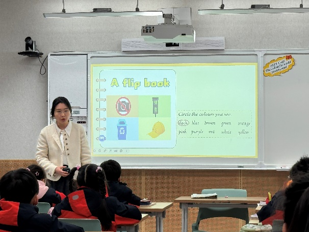 首先,竞舟二小的刘安然老师带来了 2024 版 PEP 三上 U5 B Start to read 的展示课。课堂上,刘老师巧妙地将色彩知识融入教学,以“Colors are useful”为主题,通过翻书圈色、连线图片与句子等趣味活动,带领三年级(1)班的小朋友们在色彩的海洋中畅游。从识别“red、green、blue、yellow”等基本颜色,到理解它们所传达的信息,如“Red can say no”“Green can say go”等,孩子们在轻松愉悦的氛围中积极举手发言,踊跃参与开火车读对话、垃圾分类视频学习及翻页书阅读展示等环节,不仅学会了颜色单词,还掌握了“It’s __________.”“What can ______say? ______can say no.”等句型,更领悟到颜色在生活中的丰富含义。