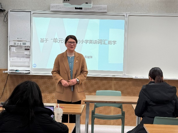 随后的讲座环节同样精彩纷呈。竞舟小学的陈益珠老师则聚焦“基于‘单元视角’的小学英语词汇教学”,强调词汇教学应从音形义、词不离句迈向单元意识和语篇意识。在阐述何为语篇教学时,她引用了郑文老师的观点,阐述了英语学习活动观,即从学习理解到应用实践再到迁移创新的过程,并强调了情境创设、活动设计和评价跟进的重要性。除此之外,陈老师还通过“plants around us”的课例,展示了如何融入语境、基于主题、聚焦语言进行词汇教学。她提醒师范生在备课时要有选择性,根据学习目标设计课程,以实现教学的最优化。此讲座为师范生提供了新的教学视角,激发了他们对小学英语教学的深入思考,是一次极具启发性的教学理念分享。