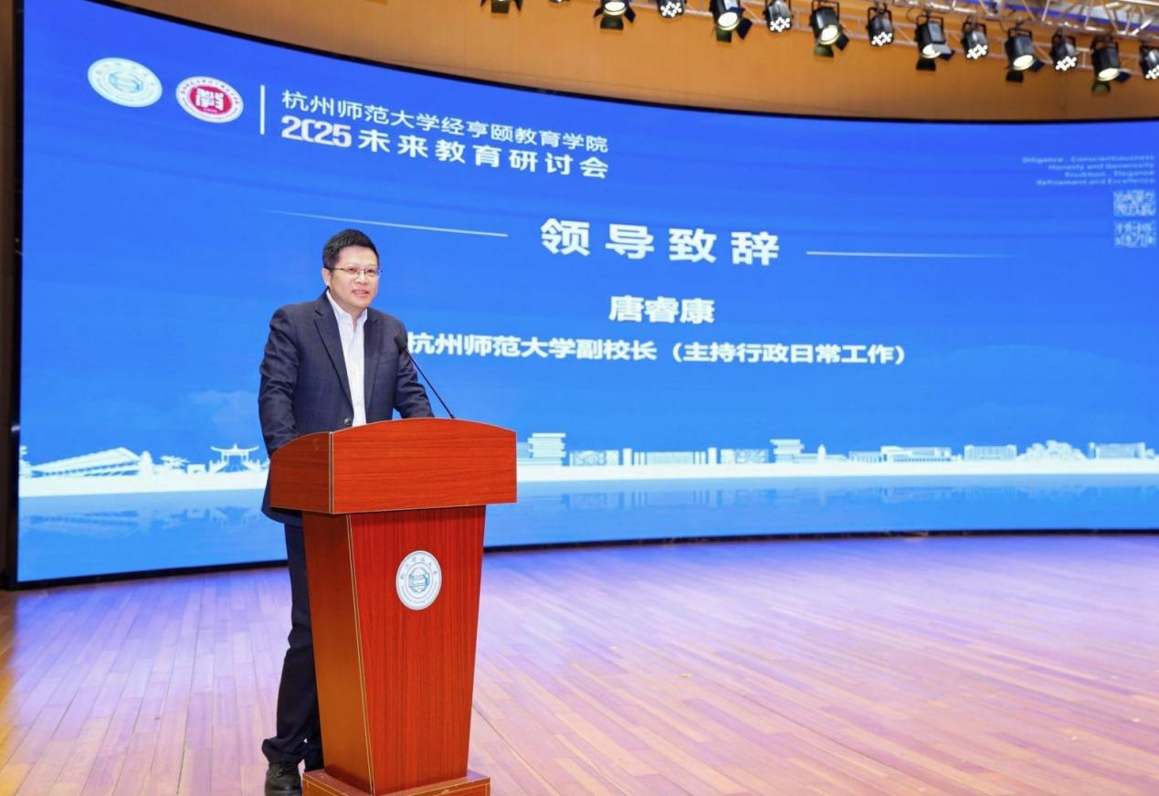 唐睿康代表学校对来自全国各地的知名专家莅临杭师大并就未来教育这一主题展开研讨表示热烈的欢迎和诚挚的感谢,对色情av影片 在AI浪潮席卷而来的时候及时举办未来教育研讨会给予充分肯定和赞赏。他指出,建设教育强国必须直面时代之问,师范大学应勇担教育改革的重任,以知识点为核心的教育体系在AI时代将面临知识记忆难以与人工智能抗衡的局面。他表示,作为创新型国家,我们在人才培养上已实现从“优秀”到“更加优秀”的跨越,未来更应推动人才培育向“从个性到杰出”的转型。他强调,AI时代正推动教育体系发生深刻变革,色情av影片 将以“人文”与“成长”为理念,构建教育新生态,肩负历史使命,积极探索教育体系的重构路径。唐睿康最后引用习近平总书记的重要论述指出,教育的根本任务是“把会学习的人培养成会创造的人”,这也为杭师大未来的教育改革指明了方向。